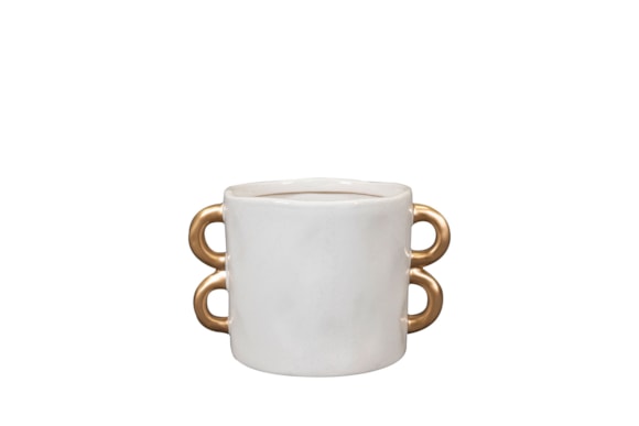 Bianca je moderní květináč s dekorativními zlatými úchyty. Má krásnou reaktivní glazuru a organický tvar. Je ručně vyrobená tradičními metodami, což se odráží v jejím autentickém designu.