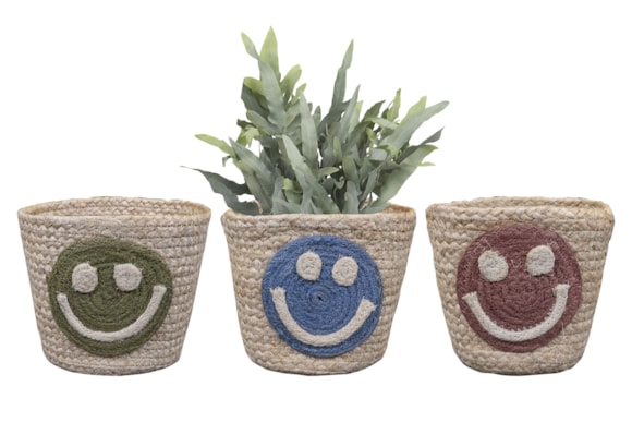 Koš Smiley je připraven rozzářit každý interiér! Tento veselý květináč je vyroben z ručně tkané juty a zdobí ho usměvavý obličej. Upozornění: při umístění rostliny do koše Smiley doporučujeme použít vodotěsnou vložku Lucas Pot Inlay.