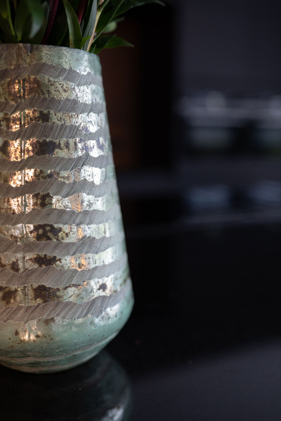 Skleněné vázy Julie jsou tradičně foukané výrobky v trendy barvách a designech. Vázy dostávají speciální nátěr a jsou následně opracované technikou scratch-off. Pro aplikaci tohoto oškrabávaného efektu je zapotřebí extra silné vrstvy skla. Masivní provedení dodává nejen luxusní vzhled, ale také pevnost a stabilitu. Nemusíte se bát ji položit na venkovní stůl, jen tak se vám nepřevrhne. Samostatná váza s květinou je příjemným dárkem sama o sobě. Můžete si vybrat z efektních barev Soft jade, Diamond a nově Bronze.