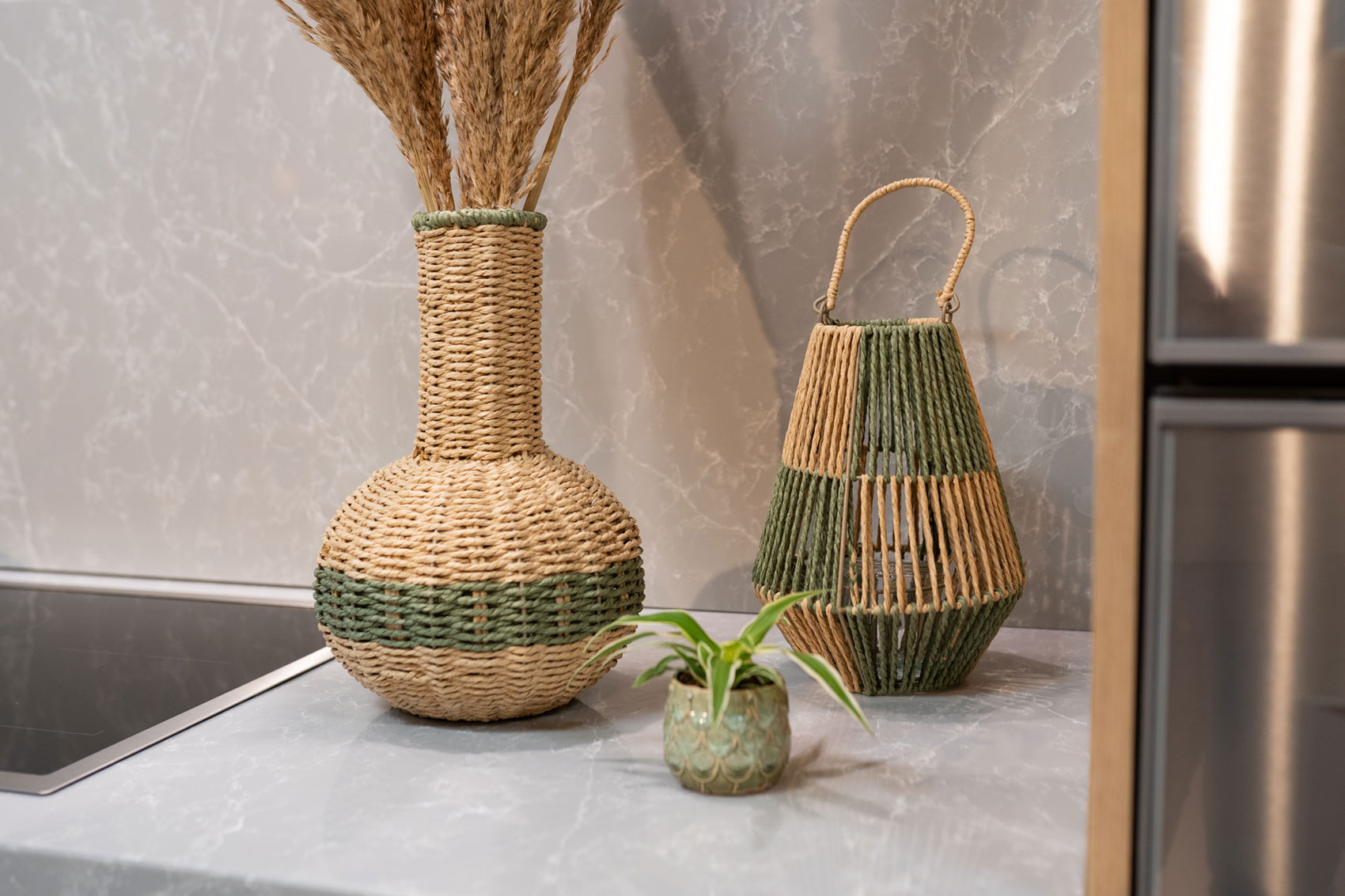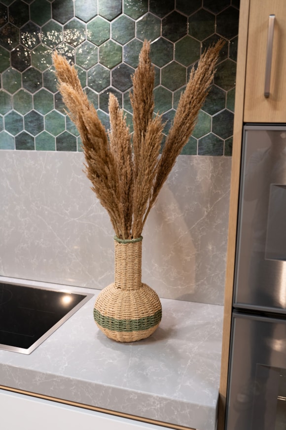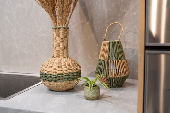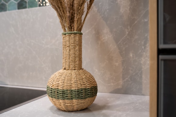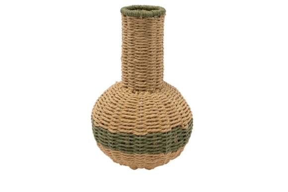 Tato váza je vyrobena z papírového provazu, známého také jako rafie. Váza je vyztužena železem. Okraj vázy má zelený okraj, který jí dodává hravý efekt. Zelený papírový provázek je propleten po stranách. Váza není vodotěsná. Je vhodná pro hedvábné květiny, sušené květiny nebo ozdobné větvičky.